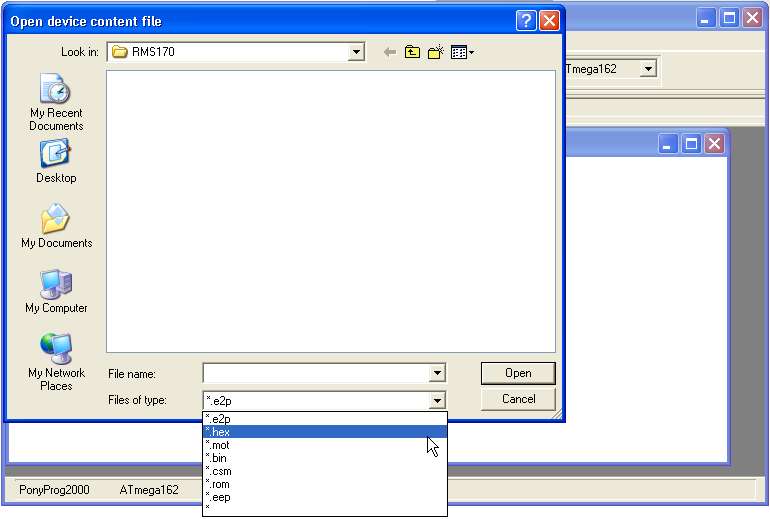 Step 15: Select *.hex from the "Files of Type" drop down combo box.