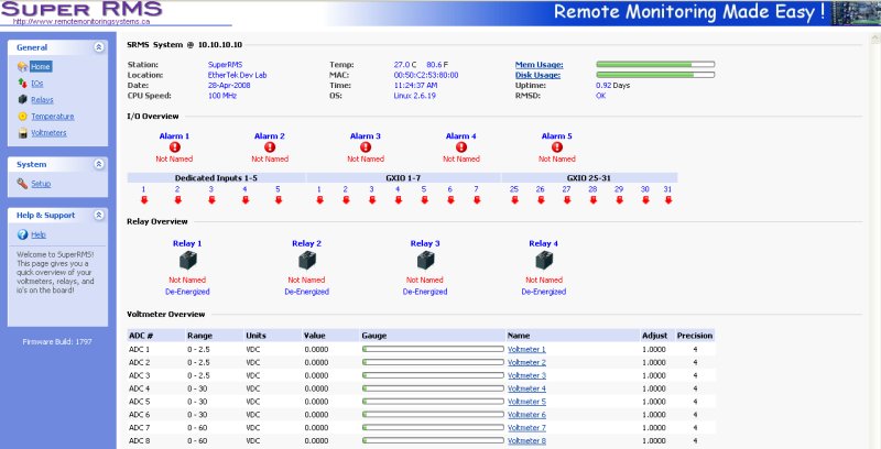 SRMS Home page. This page contains an overview of all of the functionality of the Super RMS board.