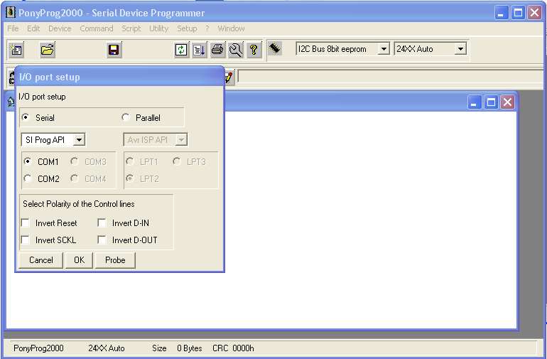 Step 4: Select "Serial", "SI Prog API", and a "Com" port, then click the Probe button.
