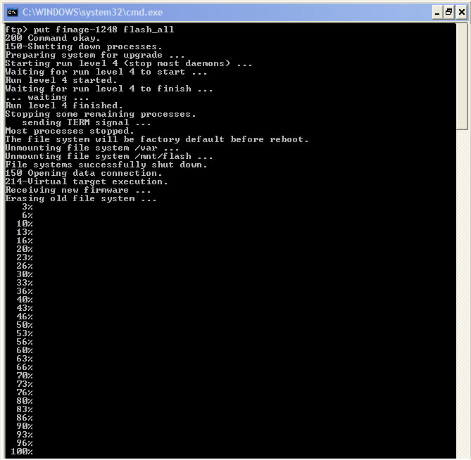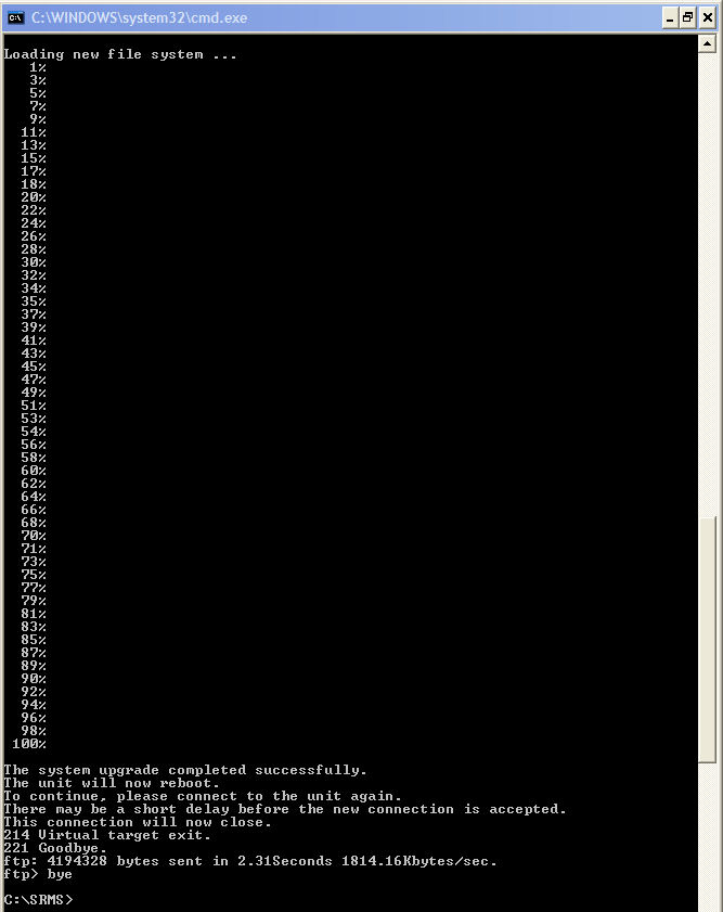 To perform a ftp based firmware upgrade, first download the latest fimage from the firmware download area to your local pc computer. The examples below assume a computer running Windows, but the commands will be similar on any OS. The examples below assume a folder on the C:\ drive called SRMS that contains the firmware that you would like to upload to your SRMS board. ![]() Log into your SRMS board with the ftp command. The example below uses the default SRMS ip address 10.10.10.10. ![]() Next type out put fimage-xxxx flash_all (where xxxx is the firmware build number), then press Enter. The SRMS unit will now start its firmware upgrade procedure. You should see similar output to the screen shots below. NOTE: flash_all is a Level 2 firmware upgrade, enter only flash for a level 1 upgrade. ![]() At this point the read-only partition (cramfs) that contains the Linux Kernel has been erased. The new Linux Kernel partition is about to be written. ![]() At this point the new Linux Kernel partition has been written to flash. The read-write partition (jffs2) is about to be erased. ![]() At this point the jffs2 partition has been erased and is about to be flashed with the new partition. ![]() When the firmware programming is complete, the SRMS board will reboot with the new firmware image. At this point you may configure the SRMS board, DNS settings, upload your data base, add scripts etc. include ("../sd_footer.php"); sdfooter(); ?> |